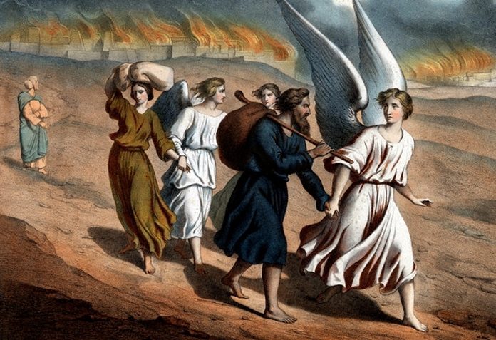 Находясь у Лота, ангелы рассказали ему как племяннику Авраама, для чего они явились, и посоветовали, чтобы спастись от гибели, взять семью и бежать со всем, что у них есть, не мешкая и ни в коем случае не оглядываясь.