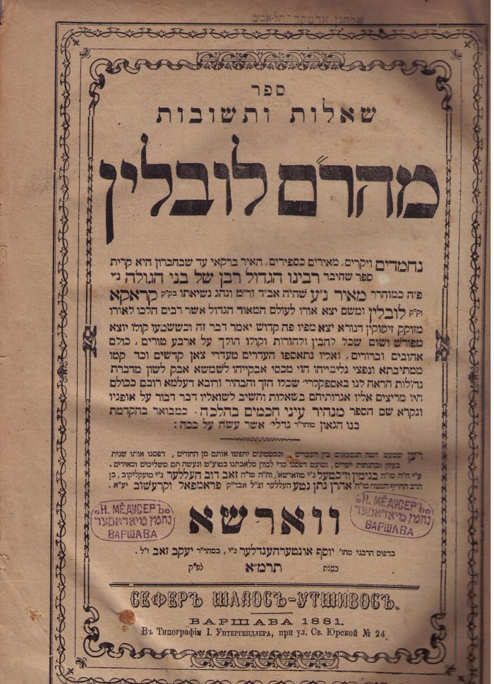 Маарам из Люблина был одним самых авторитетных законоучителей своего поколения – из многих общин диаспоры обращались к нему за решением спорных вопросов. Сто сорок его ответов приведены в сборнике Шеэлот утшувот Маарам миЛюблин (Респонсы нашего наставника р. Меира из Люблина) – в этой книге отразился и его аналитический дар, и феноменальная эрудиция.