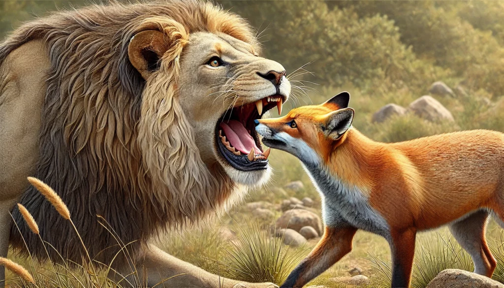 Лев застыл в изумлении, пораженный находчивостью лисицы. А она, воспользовавшись моментом, ловко ускользнула в чащу, оставив царя зверей наедине с его голодом и совестью.