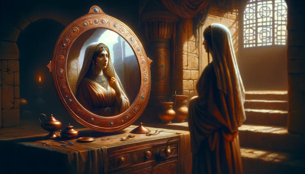 Пишет Раши в своем комментарии: «У дочерей Израиля были медные зеркала, в которые они смотрели, когда украшали себя. И их тоже они принесли в дар для скинии. Однако Моше они внушали отвращение тем, что изготовлены были в угоду дурному побуждению, и он не хотел их брать. Сказал ему Святой, благословен Он: «Возьми! Ибо они Мне милее, чем все другие приношения, ведь с их помощью женщины родили в Египте многих еврейских детей. — Когда их мужья изнывали от тяжких подневольных работ, жены шли и приносили им еду и питье, и давали им поесть. И брали они зеркала, и каждая смотрела в зеркало на себя вместе со своим мужем, и говорила при этом с нежностью: «Я миловиднее тебя». Тем самым женщины внушали своим мужьям вожделение, и совокуплялись с ними, и зачинали, и рождали там… И из этих зеркал был сделан сосуд для омовения».