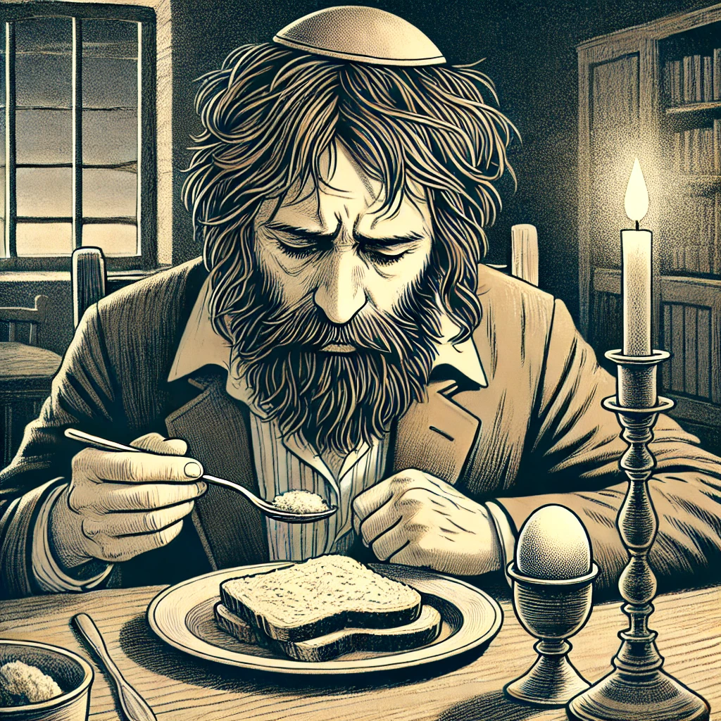 Согласно обычаю, во время этой трапезы едят вареное яйцо или чечевицу, которые (из-за своей круглой формы) являются символами траура — и тем самым исчерпывают «норму» вареных блюд. Ничего другого вареного или жареного не едят и утоляют голод хлебом, молоком или фруктами. Существует обычай обмакивать кусок хлеба в пепел и есть его с этой «приправой».