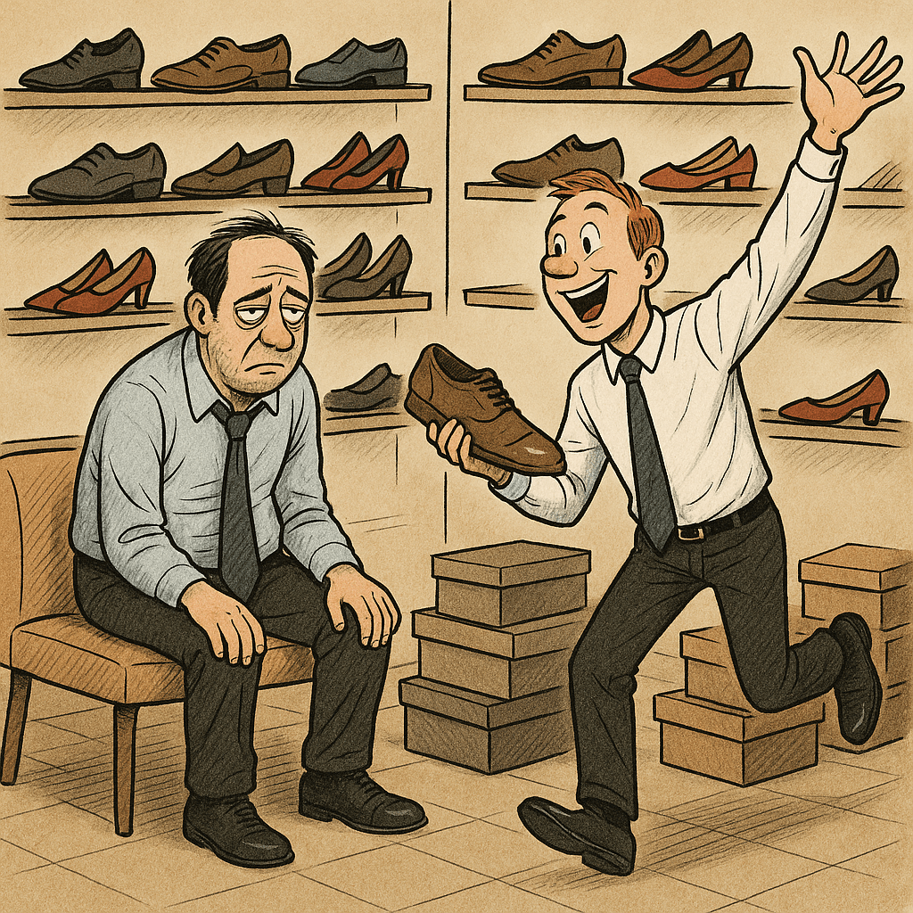 Тед работал в обувном магазине. На протяжении целого дня он встречал покупателей, интересовался размером их обуви, уходил в дальний конец магазина, где была кладовая, и приносил им оттуда подходящие пары для примерки. Затем он забирал не подошедшие туфли и возвращался с другими парами обуви, которые покупатель примерял. И так снова и снова, множество раз, с утра и до вечера. Тед очень уставал и чем позже, чем чаще украдкой поглядывал на большие часы, что висели на стене у входа. Ему очень хотелось домой.